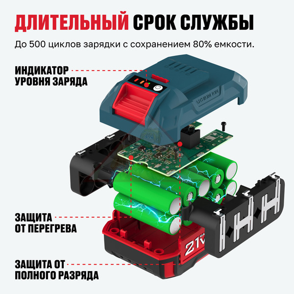 Защита от перегрузки: батарея отключит инструмент при чрезмерных нагрузках, предотвращая его поломку